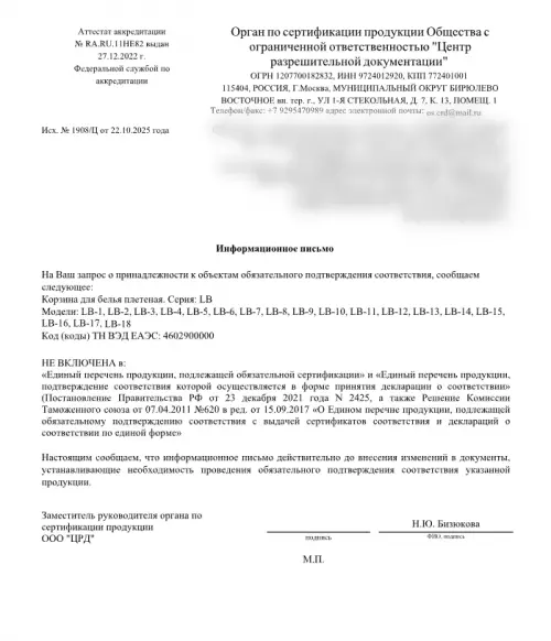 Официальный документ, подтверждающий, что товар не подлежит обязательной сертификации или декларирования в РФ
